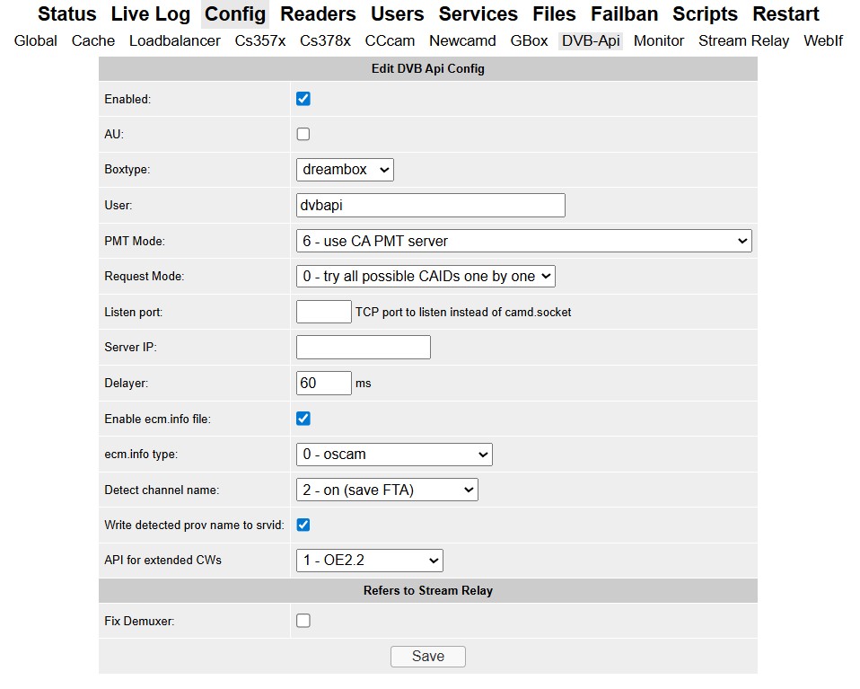- Im Abschnitt [dvbapi] der oscam.conf: folgende Parameter hinzufügen/ändern (oder über das WebIF Config → DVBApi).: