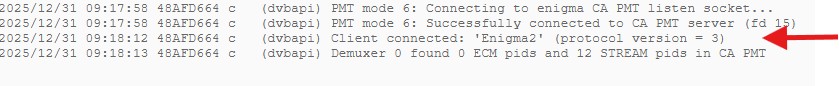 Wenn im OSCam-Log folgender Eintrag erscheint, ist alles ok: (dvbapi) Client connected: 'Enigma2' (protocol version = 3)